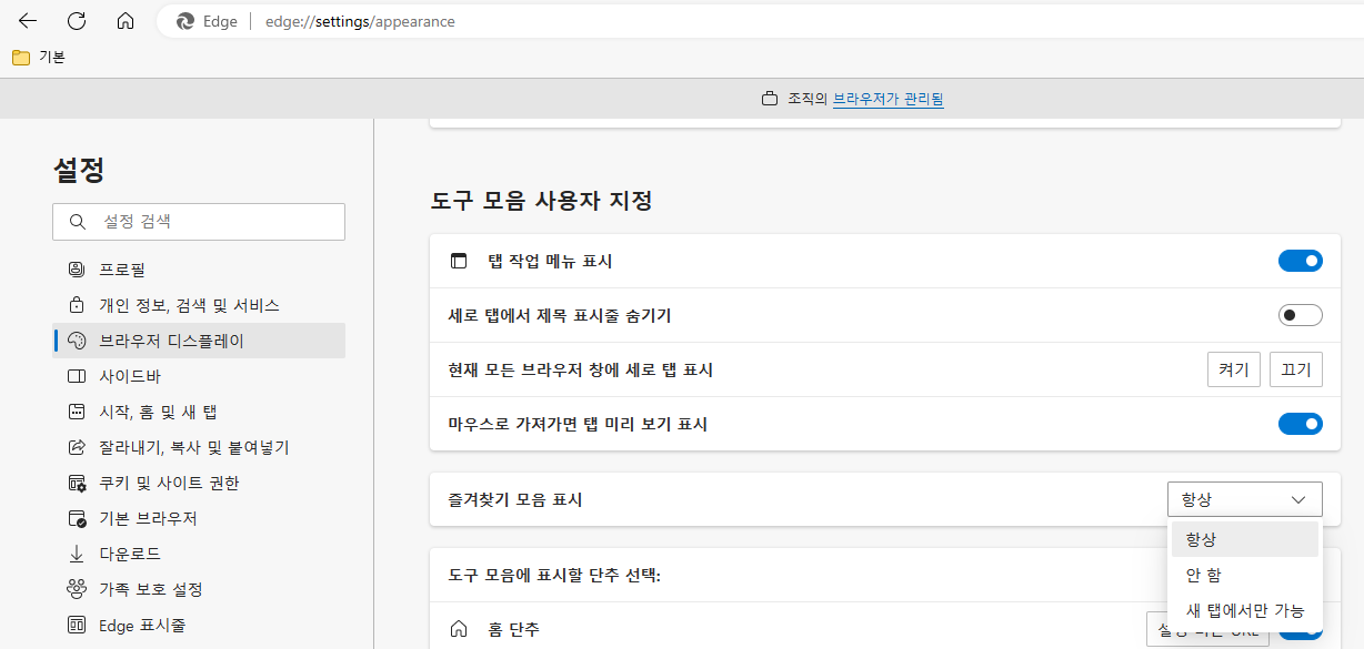 설정 > 브라우저 디스플레이 > 즐겨찾기 모음 표시 > 항상으로 변경